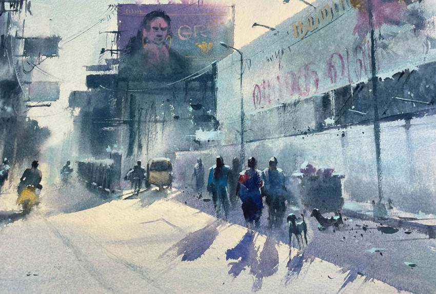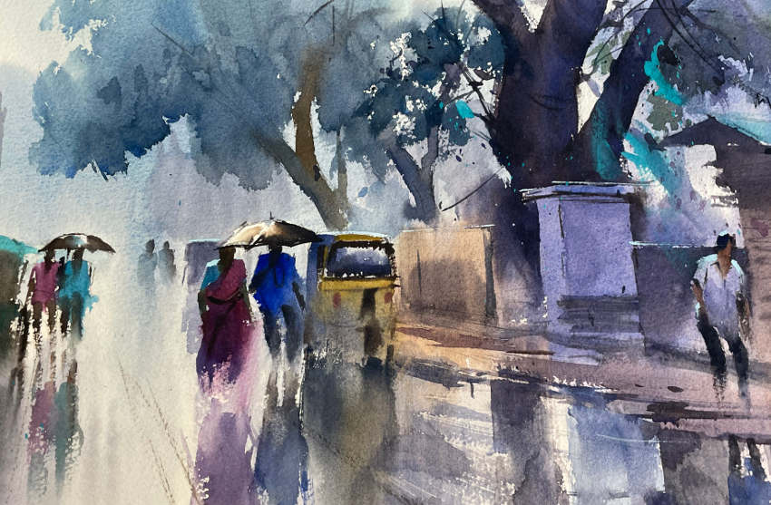 On y voit des scènes de la vie ordinaire, des tranches de vie où la population se déplace à vélo, parmi les chiens errants, dans des rues encore mouillées de pluie d’une mousson naissante. Maîtrisant à la perfection le français, Ejoumalé propose également des stages d’aquarelle à ses élèves, qui peuvent ainsi mieux appréhender les différentes manières pouvant les mener à réussir leurs toiles. A noter un excellent autoportrait de l’artiste qui trône en bonne position au sein de la galerie !