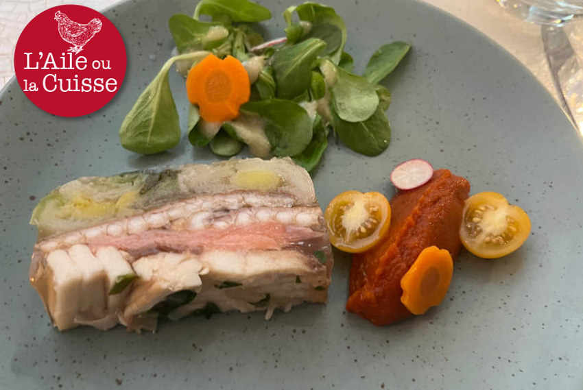 L'accueil y est des plus aimables. Ouvrons le menu qui en ce 03 septembre, est annoncé d'automne.....de façon un peu prématurée ! L'apéritif est servi avec une petite mousse de courgettes. En entrée, je choisis le pressé de raie et de saumon fumé au blanc de poireau, condiment de tomates concassées. Mention spéciale pour la saveur et la concentration de tomates qui s'allient bien avec notre pressé, qui manque cependant d'un petit quelque chose : herbe aromatique dans l'appareil, un rien d'assaisonnement. Entrée plaisante cependant. Quant à la soupière d'escargots, chaource et épinards : l'ensemble est plutôt bon, malgré l'imperfection de la fonte fromagère, mais à l'œil la croûte eût mérité de bronzer encore quelque peu ! C'est cependant une bonne entrée, originale et travaillée !