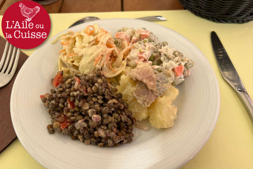 Le menu du jour est proposé à 17 euros. La serveuse y est plutôt aimable. Quant au traditionnel « kir », il n'est franchement pas inoubliable ! Un buffet d'entrées est présent, suivi d'un choix de trois plats et de cinq desserts. Quatre salades composent ledit buffet, elles paraissent majoritairement faites maison, dont l'une aux choux est bien assaisonnée. Le pain est bon également.