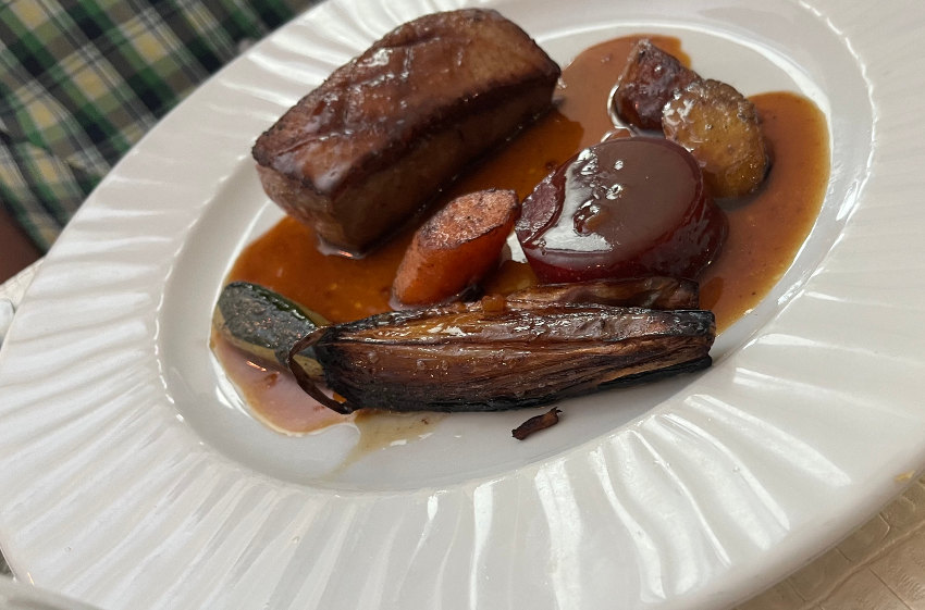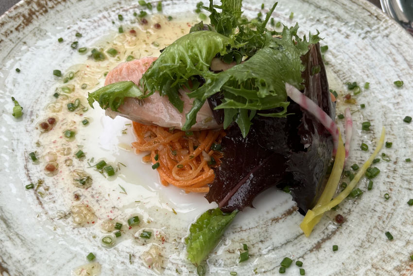 L'entrée est un saumon confit, râpé de carottes, vinaigrette au citron et mesclun de salade. Cette entrée fraîche tient toute ses promesses et son assaisonnement est à l'unisson avec cette plaisante petite pointe d'acidité caractéristique ! C'est fort bon et accompagné d'un bon pain d'artisan boulanger, l'ADN de la maison.