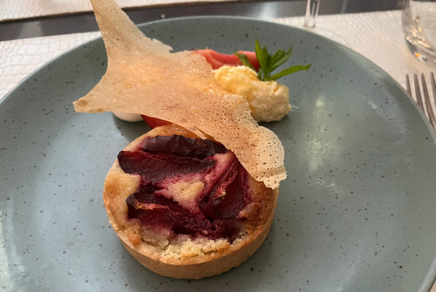 L'assiette de fromages est proposée avec des produits bien affinés, dont un fromage de chèvre du cru. Le dessert est une tarte amandine aux prunes, crème au Calvados. Cette pâtisserie servie tiède est pour moi le meilleur plat de ce bon déjeuner. Elle est proposée tiède : cela sublime le côté amandine, qui se marie parfaitement avec l'acidité de la prune. Idéal pour terminer le repas.