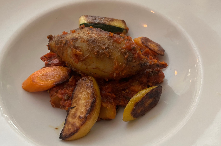 En plat, l'encornet farci au boudin noir, pommes en persillade est dressé sur une concassée de tomates des plus goûteuses, une fois de plus ! Cela donne à ce plat original une bonne harmonie. Le filet de cannette est servi rosé comme demandé.