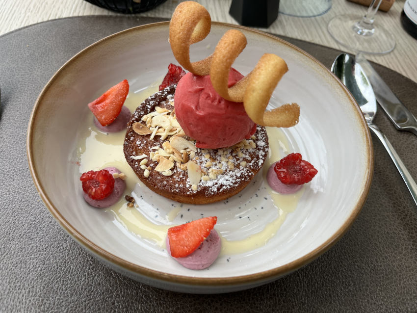 Le dessert est lui aussi très bien dressé. Il s'agit d'un financier aux fraises, crème anglaise et d'un excellent sorbet framboise. Ce fruit estival est si fin, si délicat. Au « Rive Gauche », glaces et sorbets sont conçus maison. Cela confère au moment du dessert une autre dimension gourmande ! Si l'occasion estivale vous est donnée, goûtez la sublime glace à l'abricot, c’est l'une de mes préférées ! Le financier est servi légèrement tiédi, cela « enveloppe » délicatement notre dessert du jour. 32 euros pour ce très bon déjeuner. Que sert-on dans une minable chaîne à ce prix-là ? Rien de bon, c'est certain, ni de frais d'ailleurs. Ou plutôt si, très frais, voire glacés puisqu'intégralement congelés, hélas...