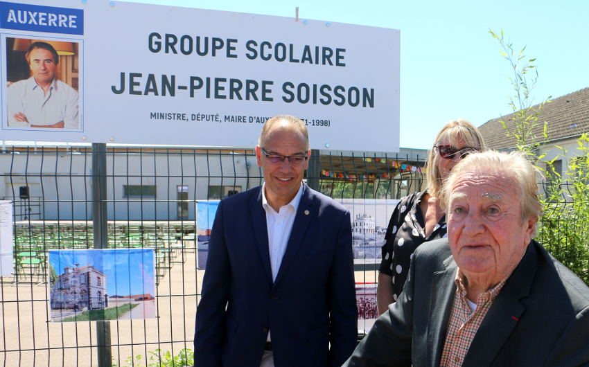 « L’ancien ministre, député et maire d’Auxerre – entre autres ! – Jean-Pierre SOISSON a reçu le plus beau des cadeaux qu’on pouvait lui offrir un jour : son patronyme est désormais associé à l’existence du groupe scolaire de Laborde… ».