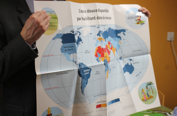 D’ailleurs, la représentante de la structure, en l’occurrence sa présidente, Christine AITA, ne manque pas une miette des explications fournies par Thierry CHANUSSOT, directeur du territoire Nord-Bourgogne de VEOLIA. Carte façon planisphère à l’appui, ce dernier en bon pédagogue explique la situation de l’eau à l’échelle du globe. L’eau douce disponible par habitant sur la Terre. Et à bien regarder la carte dépliée par notre interlocuteur devant les yeux intéressés des institutrices de l’école maternelle de Villethierry, il y a du souci à se faire pour certains des pays du continent africain ou du Moyen-Orient. La guerre de l’eau est déjà dans tous les esprits ; le réchauffement climatique et son aggravation n’arrangent rien en matière de crise géopolitique qui risque de poindre son nez dans l’échiquier planétaire.