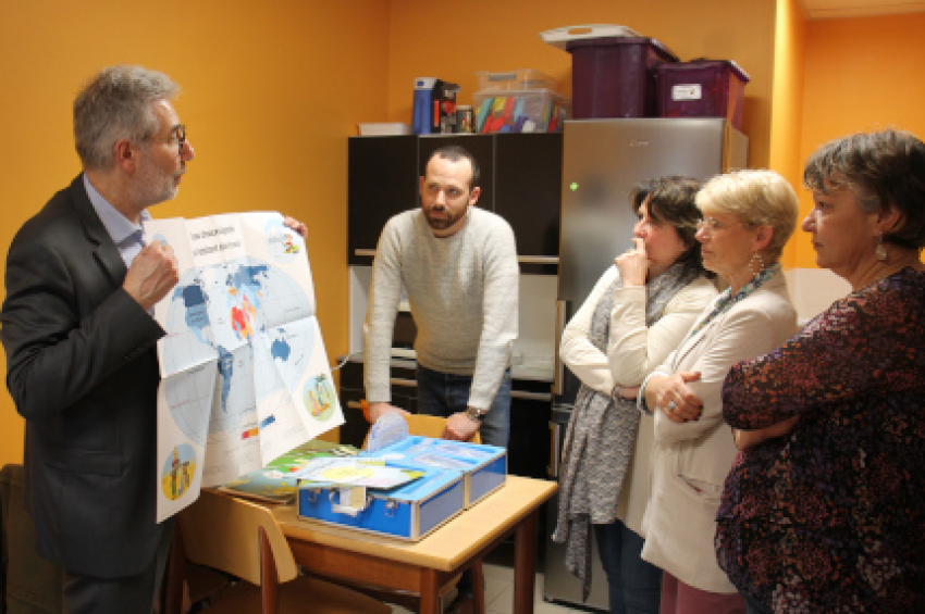 Les enseignantes posent des questions sur le contenu de cette mallette magique qui propose pipettes, fioles, et ustensiles utiles à des prélèvements. Une manière ludique de découvrir le cycle de l’eau, tel un mini-laboratoire portatif puisque facile à manipuler. Commentaires de Thierry CHANUSSOT durant son exposé aux représentantes du SIVOM et aux enseignantes, « cette mallette pédagogique permet à l’élève de suivre une vraie démarche scientifique, basée sur l’observation, la formulation d’hypothèses, et la validation par l’expérience… ».