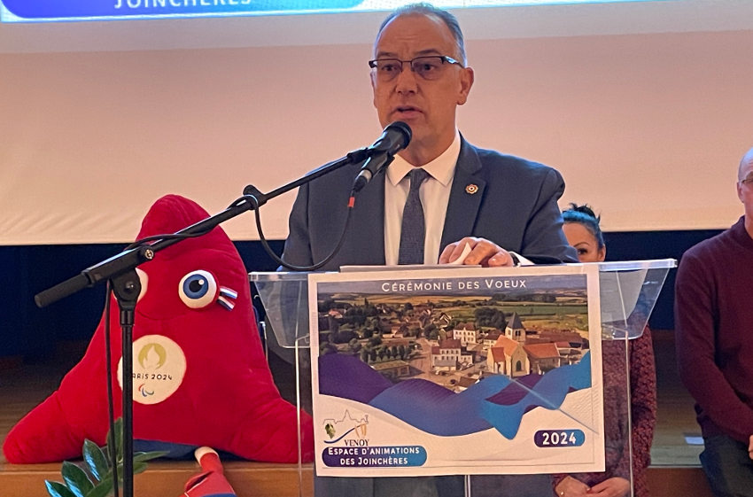 VENOY : Avec deux exemplaires de la mascotte officielle des Jeux Olympiques de Paris en arrière-plan, Icauny et Yonna, posés sur le fond de la scène, pas de doute : le fil d’Ariane de cette énième cérémonie des vœux arborait une dynamique sportive à laquelle se référa le plus souvent l’orateur du soir, le maire Christophe BONNEFOND.