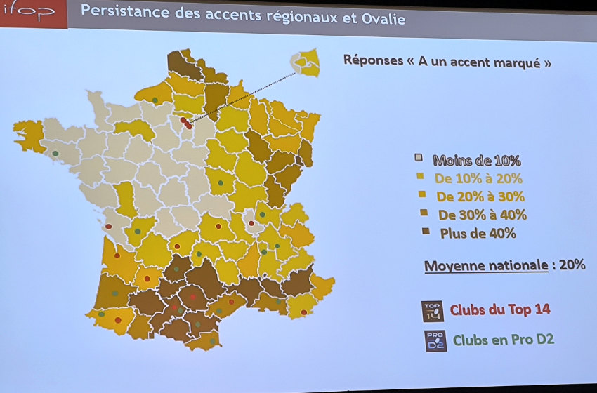 Certaines zones périphériques en revanche, comme le Pas-de-Calais, l’Alsace et surtout, la région Midi-Pyrénées, affichent encore fièrement leur phrasé régional. Et si l’on superpose cette carte des accents à celle des clubs de rugby de l’Ovalie, la correspondance saute aux yeux, « et d’ailleurs, ça ne vous a pas échappé, si vous regardez un match à la télé, ceux qui commentent n’ont pas un accent picard ! ».