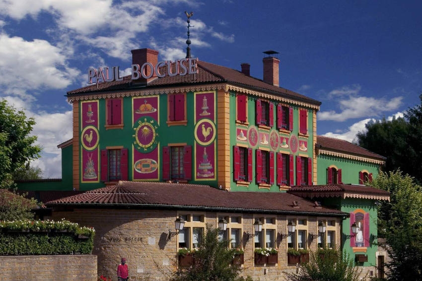 On ne se rendait pas au restaurant chez lui ; non, on allait chez Paul BOCUSE ! La façade est clinquante couleur framboise et pistache, les plaques rappellent les crues de la Saône (1955/83).