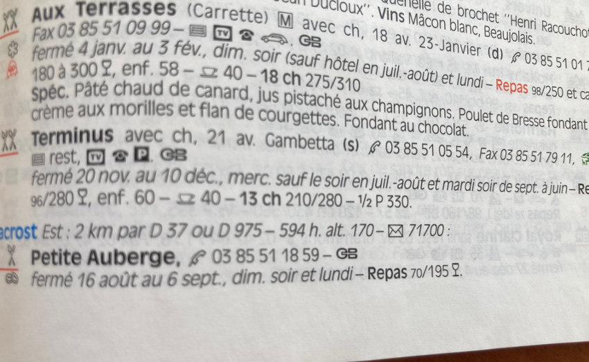 « Dans la famille CARRETTE, le fils Jean-Michel qui a succédé au regretté Michel trop tôt disparu a fait ses armes chez les frères TROISGROS à Roanne. Autant dire que la cuisine est bonne dans cette étape incontournable du sud de la Bourgogne. A pratiquer sans modération ! ». « Dans la famille CARRETTE, le fils Jean-Michel qui a succédé au regretté Michel trop tôt disparu a fait ses armes chez les frères TROISGROS à Roanne. Autant dire que la cuisine est bonne dans cette étape incontournable du sud de la Bourgogne. A pratiquer sans modération ! ». Crédit Photos : Gauthier PAJONA.