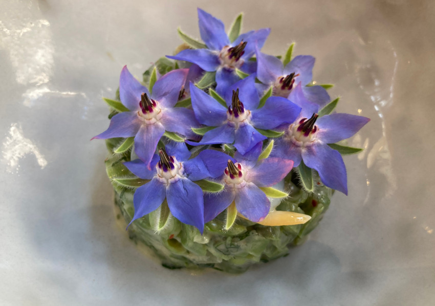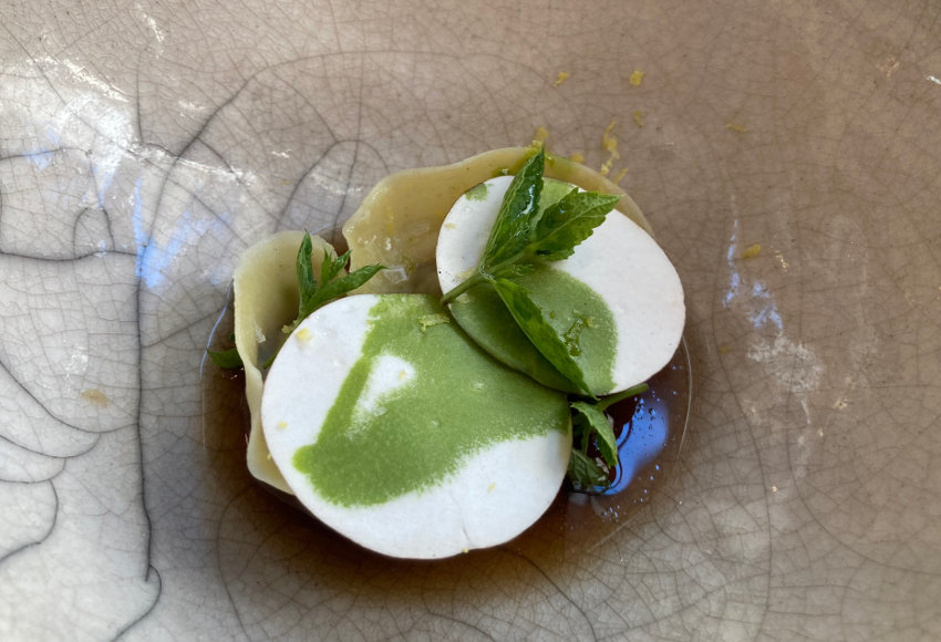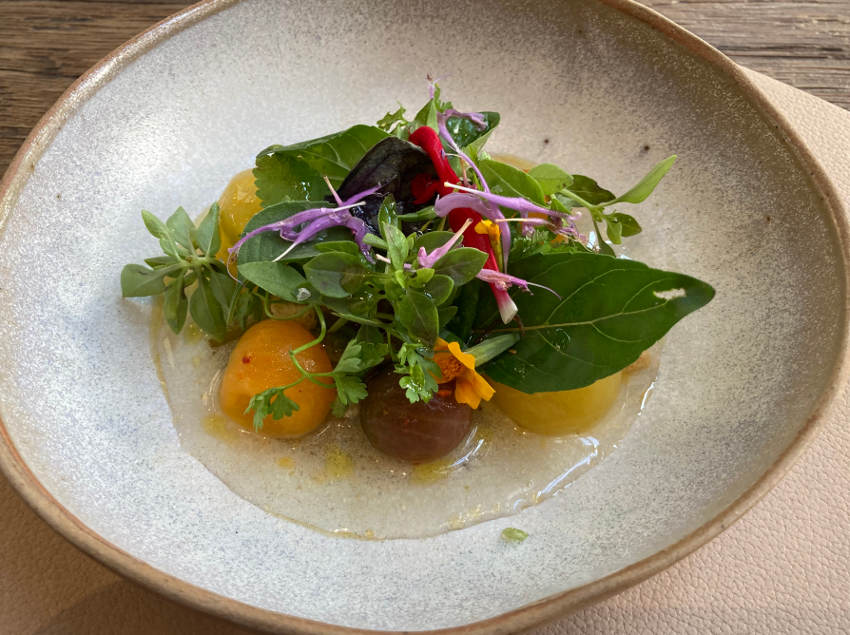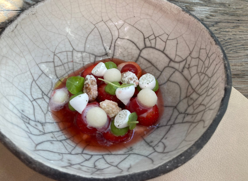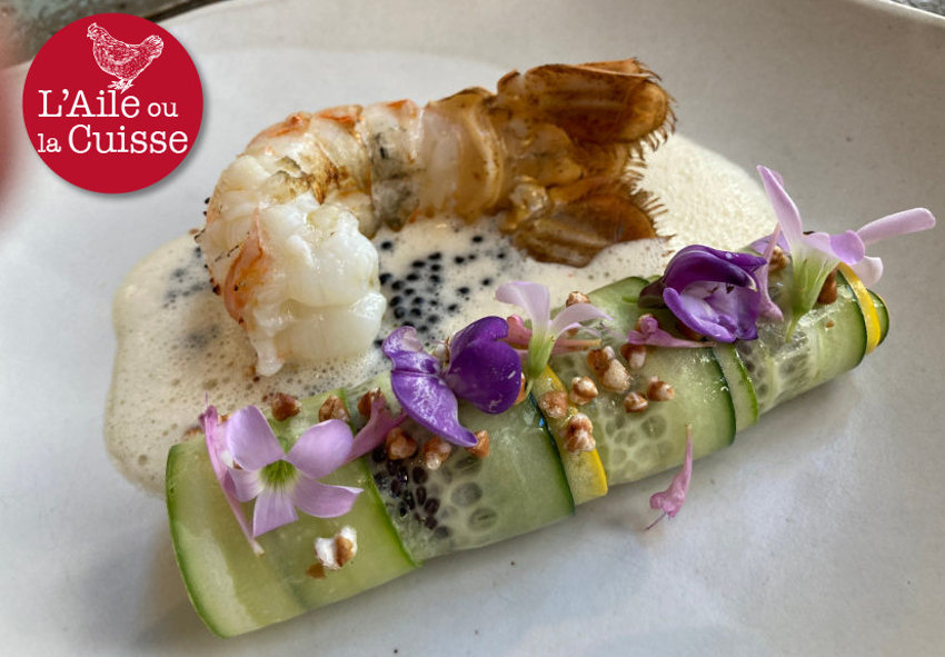 Les vins sont souvent ceux de jeunes vigneronnes et vignerons qui viennent de se lancer ! De jolies assiettes dans lesquelles sont dressées des mets fins et délicats : on pense aux tomates de Jérôme et leur eau goûteuse et sucrée ;  l'étonnant carpaccio de haricots verts au coq (quel accord !), les petits pois, l'impeccable langoustine cuite sur bois ou le pigeonneau délicatement rosé (petit clin d'œil affectueux à la cuisine paternelle, peut-être...).