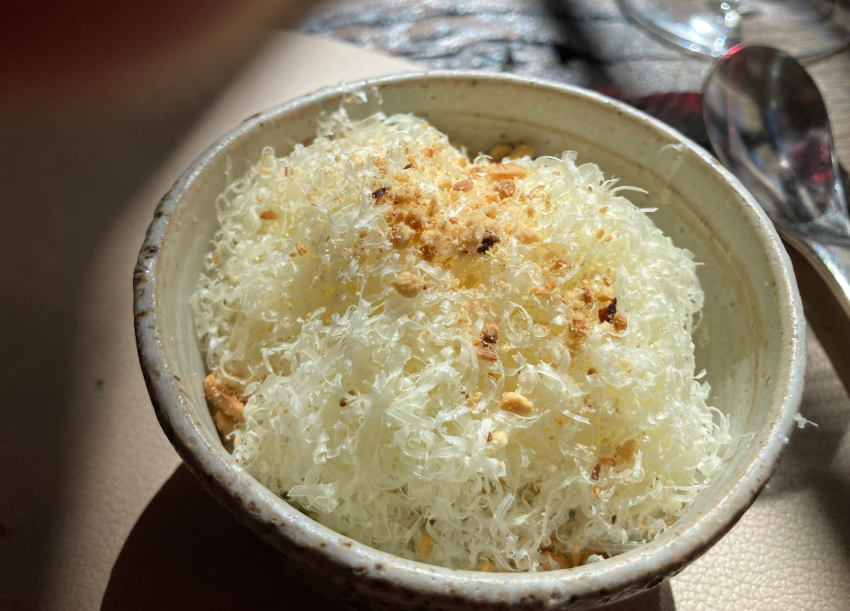 Le comté de vingt-quatre mois râpé et sa crème au Savagnin sont aussi un modèle du genre. Et, c'est sciemment que l'on conserve un « p'tit » cocorico icaunais pour la fin, puisque la truite servie provient de Crisenon !