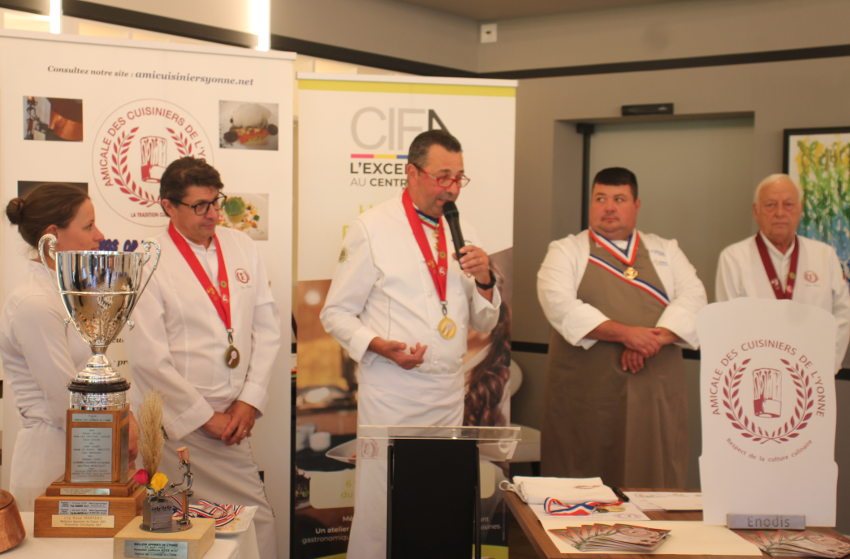« Le concours du Meilleur Apprenti cuisinier de l’Yonne, baptisé au nom du MOF Guillaume ROYER, a accueilli trois valeureux candidats qui ont élaboré durant plus de quatre heures un menu complet composé d’œufs mollets, de poulet sauté et d’entremets à base d’oranges. C’est le jeune Gabriel ENFERT, apprenti chez l’étoilé Jean-Michel CARETTE à Tournus (« Aux Terrasses ») qui a su tirer son épingle du jeu en se qualifiant pour l’épreuve régionale à l’automne… ».