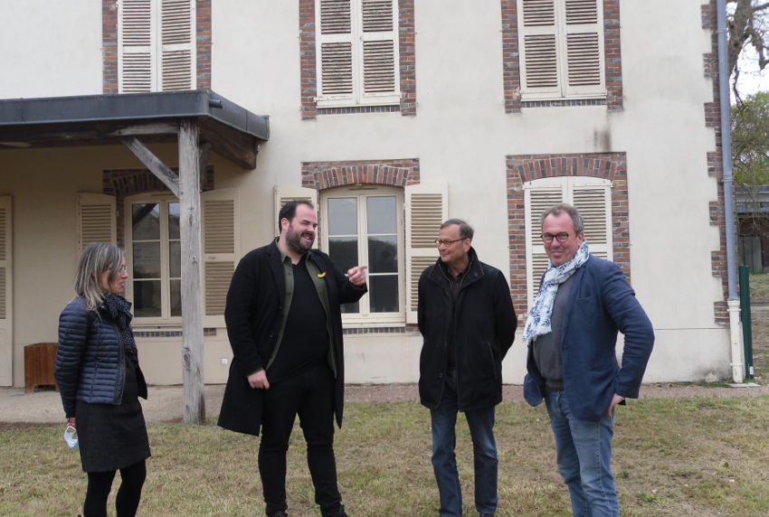 « Dans la grande salle de conférence, Elisabeth LEBEGUE, directrice de la Maison Normand, Jean-Philippe SAULNIER-ARRIGHI, président de la Communauté de Communes Puisaye Forterre, Eric PAURON, maire de Champignelles et Thomas DARIEL, fondateur de la MaNa visitent le site de la future « Cité des Métiers d’Art » qui s’implantera en Puisaye-Forterre… ».