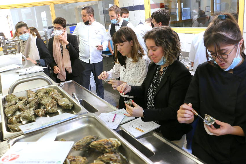 Une aventure entamée il y a quinze ans, en partenariat avec l’Institut Bocuse à Lyon, qui permet aujourd’hui à un millier d’élèves de grandes écoles culinaires ou de lycées régionaux, de se former chaque année à ce produit complexe et parfois mystérieux qu’est l’huître. D’autant, souligne Serge GOULAIEFF, professeur référent de la classe, que le sujet est tombé l’an dernier à l’examen restauration, où les candidats ont eu une assiette d’huîtres à préparer.