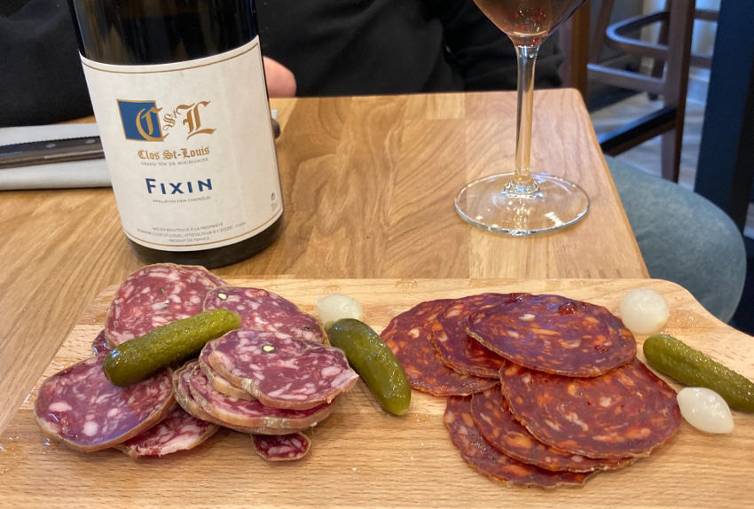 On s'attable donc confortablement dans cette petite salle contiguë à la boucherie. La planche-apéritif, composée de saucisson de porc noir de Bigorre bien poivré et de chorizo est plaisante. Avec ce joli vin de Fixin. Aujourd'hui, la maison propose une souris d'agneau ou une entrecôte blonde d'Aquitaine. Le tout est accompagné de gratins (chou-fleur ou courgettes). Ou bien votre autre choix se portera sur le bel étal que l'on zyeute depuis notre table !