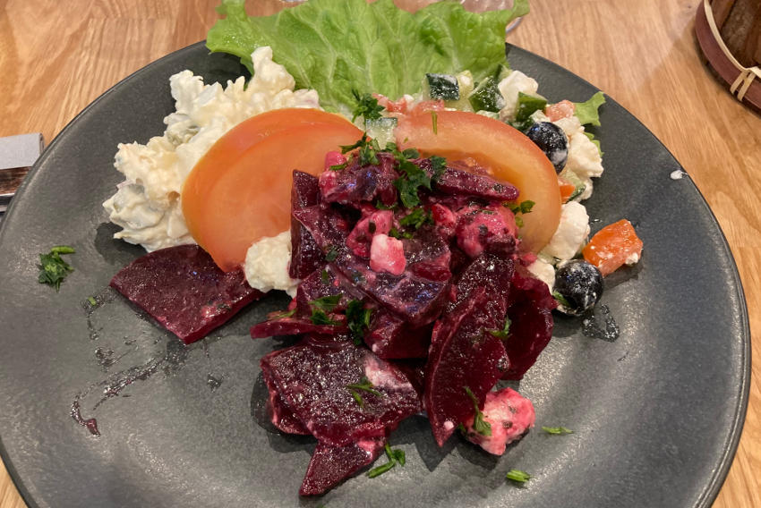 Quelques crudités pour commencer : de la betterave, une bonne piémontaise et une salade grecque, sans sirtaki, dommage ! Une dame seule se régale à la table voisine. Derrière nous, des parents déjeunent avec leur fille restauratrice. Elle est établie avec son mari, en terre vendéenne, à Aizenay. L'établissement s'appelle « La Sitelle ». Le Michelin parle de recettes originales avec de nombreux accords terre-mer, ainsi que d'un accueil agréable et attentionné.
