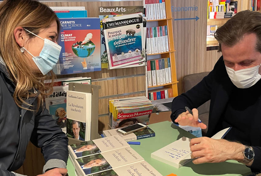 AUXERRE: Etonnant tableau que celui proposé à l’intérieur de la librairie « Obliques » près de l’hôtel de ville ce samedi après-midi. De sa plus belle plume, le député de la première circonscription de l’Yonne Guillaume LARRIVE devait écrire quelques mots de bienveillance et de sympathie sur la page de garde de son livre à l’attention de la future lectrice présente en face de lui.