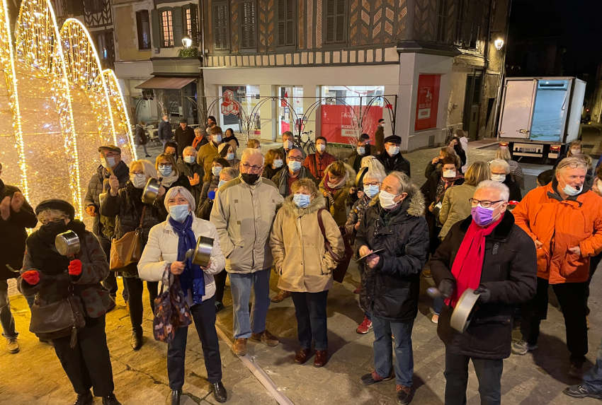 Curieuse scène qui a interloqué bon nombre de passants jeudi soir sur le parvis de l’hôtel de ville de la capitale de l’Yonne. Une quarantaine de personnes, brandissant cuillères, louches et casseroles, ont organisé un tapage nocturne à susciter l’intervention des forces de l’ordre ! Ces dernières se contentant d’observer du coin de l’œil, à distance, ce rassemblement pacifique mais bruyant proposé sous les fenêtres calfeutrées de la mairie…