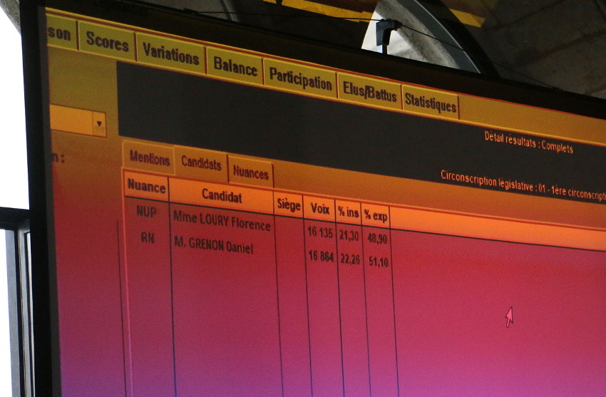 « A croire que l’écran installé à la préfecture où s’affichaient les résultats tout au long de la soirée, sait s’adapter aux circonstances : vert la semaine dernière au soir du premier tour, tricolore au soir du second…Avant qu’il ne s’écroule entraînant dans sa chute toutes les désillusions des candidats battus ? ».