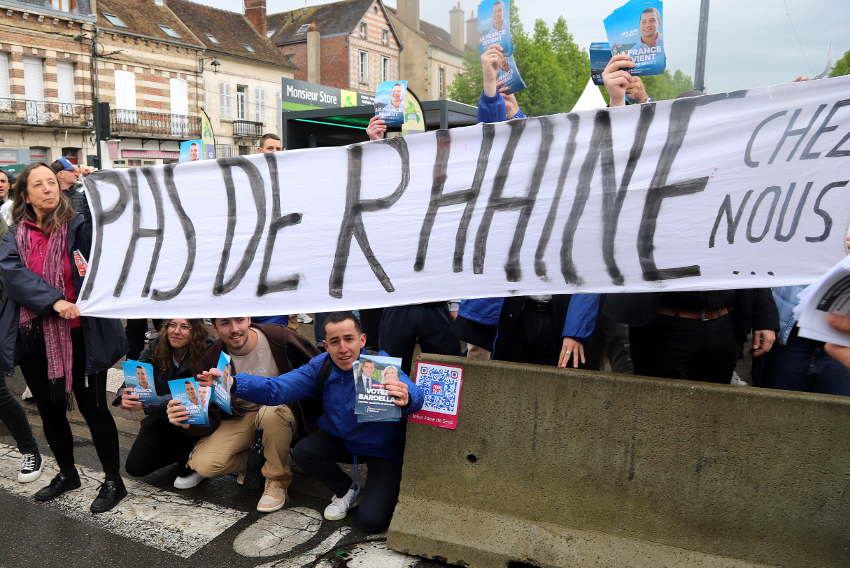 Sous les quolibets, quelques membres du collectif « 89 contre l’extrême droite » tentent de déployer une banderole au contenu explicite, « Pas de R Haine chez nous ». Laurène a bien du mal à se faire entendre : « ils sont racistes, ils sont sexistes, ils sont fascistes. C’est un parti qui ne cesse de dire qu’il défend le peuple et en réalité, sa définition du peuple, c’est défendre les milliardaires, comme MACRON… ».