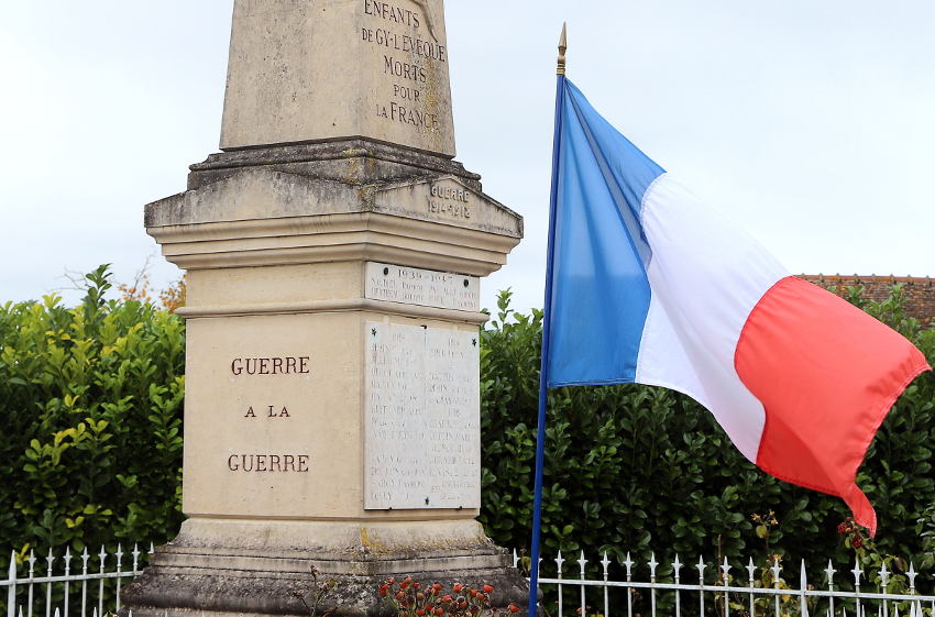 GY-L’EVEQUE : Près de 1,4 million de soldats Français sont tombés sur les champs de bataille de la Première Guerre mondiale, un poilu sur quatre ! Une hécatombe dont le sacrifice est rappelé sur les quelques 35 000 monuments aux morts érigés à partir de 1920, cicatrices minérales de l’Histoire, glorifiant pour la plupart tous ces « héros morts pour la patrie ». Révulsée par la disparition de 23 enfants de la commune, la municipalité de Gy-L’Évêque fit le choix en 1923, contre l’avis du préfet d’alors, d’inscrire sur le monument érigé au centre du village, deux messages de paix contrastant avec les inscriptions habituelles. Un siècle plus tard, ils sont toujours là et sont l’occasion chaque année d’un rassemblement pacifiste sous l’égide de la « Libre Pensée » de l’Yonne, au croisement de l’Histoire et de l’actualité mortifère et guerrière qui fait notre quotidien.