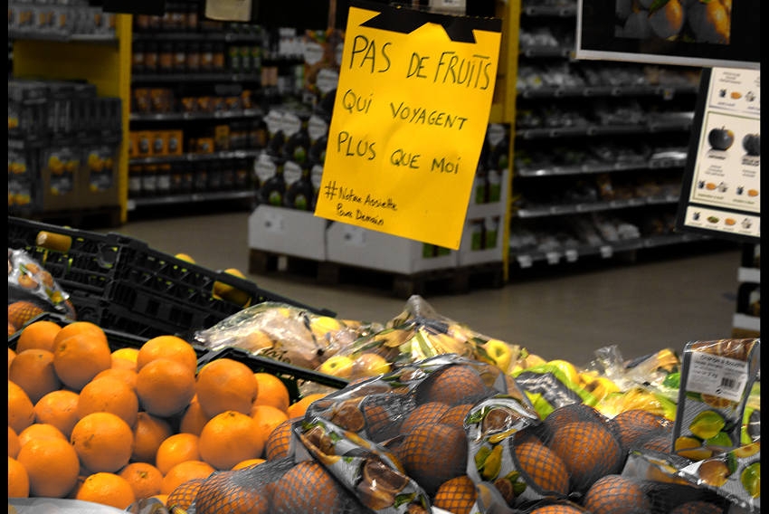 Etaient ciblés plus spécifiquement par ces affiches les rayons de l’eau (l’industrie des eaux en bouteille utilise abondamment des emballages à base de plastique), du sucre (la mention « tueurs d’abeilles » était mise en évidence), des œufs (une dénonciation contre les poules nourries aux OGM) ou encore celui des fruits et légumes (des produits qui voyagent parfois de très loin sans vraiment tenir compte de la sauvegarde de la planète au niveau carbone).