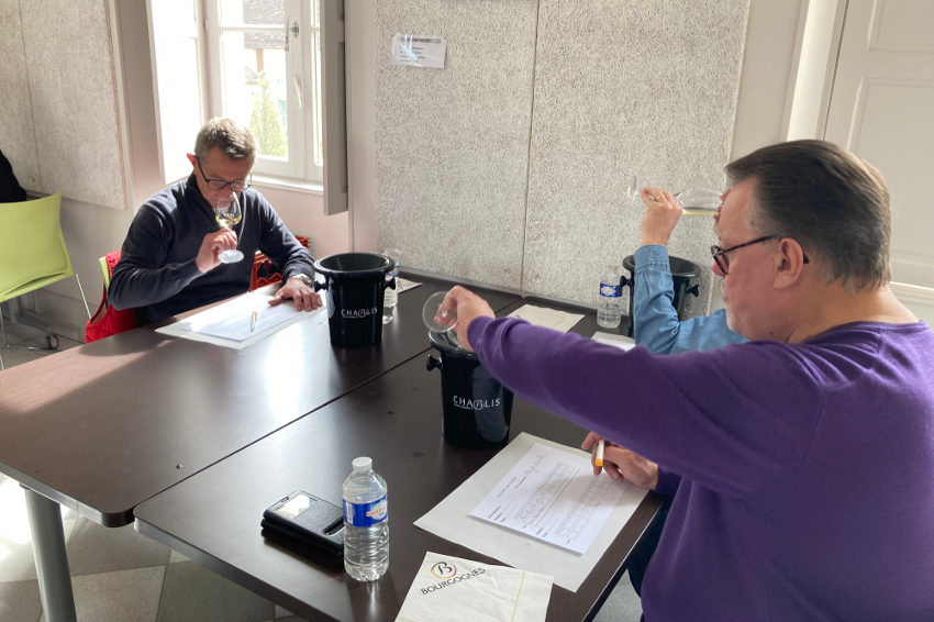 Dix heures sonnent ! Les verres s'entrechoquent. C'est parti pour cette première sélection, entre Côte d'Auxerre, Chitry, Chablis et autres Irancy. Pour être retenu pour la phase finale du grand jury, chaque vin (juste numéroté, bouteille dissimulée) doit obtenir la note minimale de 16/20 lors de la dégustation.