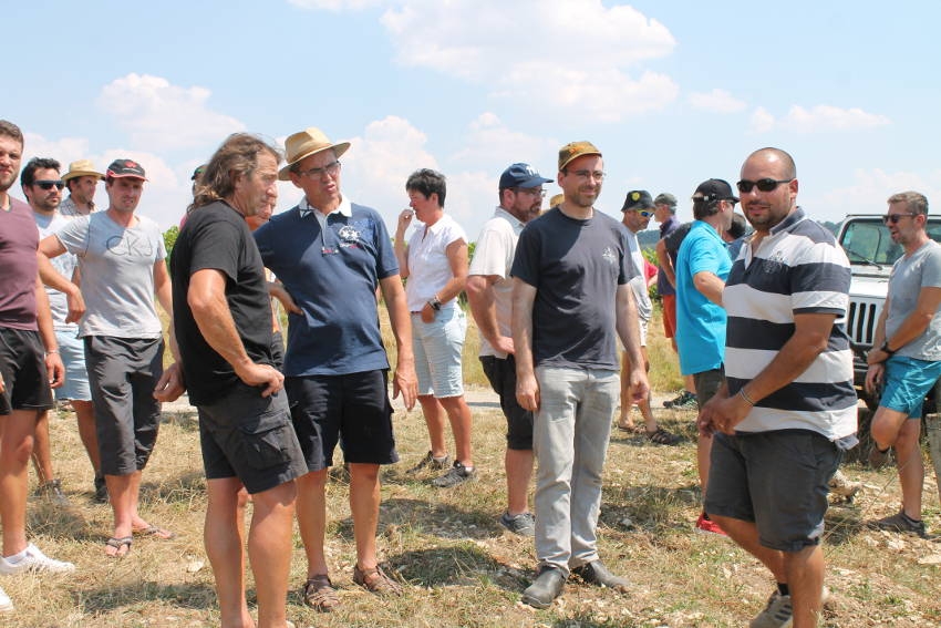 L’après-midi fut consacrée à la visite de plateformes et à la présentation de leurs résultats sur le thème « Stratégie de protection phytosanitaire sans CMR, économes en intrants et d’alternatives au désherbage chimique ». Sous une chaleur accablante, au beau milieu du vignoble, les viticulteurs stoïques devant les effets de la canicule écoutèrent les commentaires de Thierry RICHOUX, du domaine éponyme, sur les expériences menées sur ses parcelles.