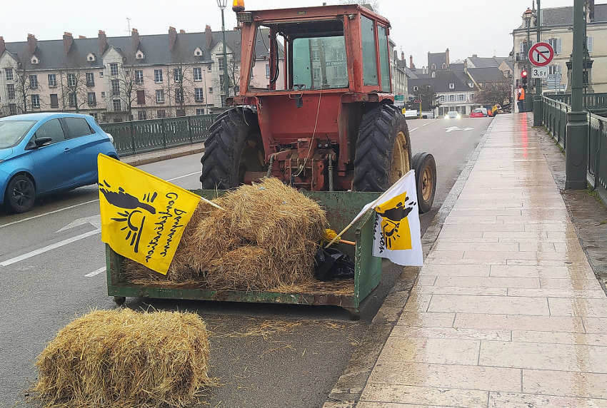 Loin des blocages de Rungis et des autoroutes parisiennes, chasse gardée de leurs confrères de la FNSEA, les sympathisants icaunais de la Confédération paysanne, marquée plus à gauche sur l’échiquier agricole, ont fait le choix d’un filtrage de la circulation sur le pont Paul-Bert à Auxerre pour y distribuer des tracts et faire part de positions les différenciant des autres syndicats, que ce soit au sujet des normes environnementales, « n’oublions pas qu’elles sont là avant tout pour protéger les citoyen.nes, les paysan.nes et la biodiversité » ou leur refus de voir les revenus complémentaires issus de la production d’énergie prendre le pas sur le reste, « nous refusons d’abandonner le combat pour un revenu digne issu de notre activité agricole elle-même… ». Pour autant, était-il nécessaire de ressortir de la grange ce modeste tracteur à l’âge canonique, contre-pied sans doute aux « monstres » de 150 000 euros croisés sur les autoroutes et aux portes de Paris ? A trop forcer le trait, l’on prend le risque de tomber dans la caricature, affaiblissant d’autant le message !