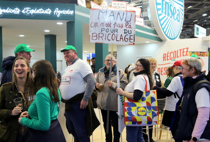 De retour du pavillon de l’élevage, « on revient du champ de bataille… » (sic!). Ces agriculteurs des Ardennes et de la Marne, tous estampillés FNSEA, affichent fièrement leur pancarte : « Manu, on n’est pas là pour du bricolage ! ». Le discours présidentiel et les propositions faites dans la matinée ne rencontrent que peu d’écho : « c’est toujours pareil, de la mascarade ! ». Plus enclins à afficher, sac en bandoulière à l’appui, les couleurs d’une célèbre enseigne low-cost, jugée comme « bien plus respectueuse des producteurs que les autres, on y trouve que des produits français… ». Une affirmation restant à prouver, dictée sans doute par le fait que ladite enseigne est depuis plusieurs années partenaire financier du Salon de l’agriculture et à ce titre, seul distributeur présent !