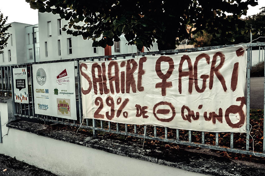 Une autre banderole sur le salaire des agricultrices qui est 29 % moins élevé que celui d'un homme soit 1/4 de plus que dans les autres secteurs, a été mise en place sur les grilles de la FDSEA.