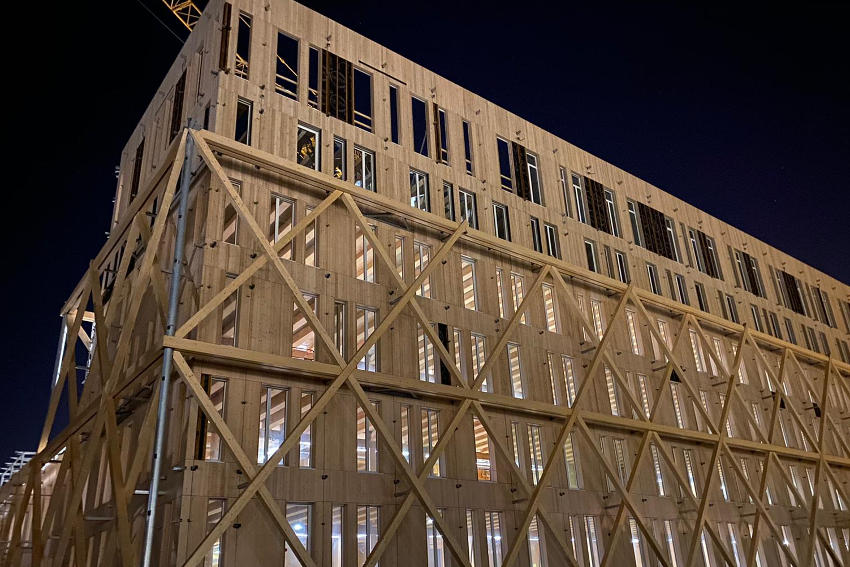 Sise sur une dalle de béton (il en aura fallu 3 032 mètres cubes), la structure bois et son exosquelette sont visibles sur l’ensemble du bâtiment selon un processus constructif à colombages. Une enveloppe de verre agrafé assure un confort thermique et protège la matière noble qui trouve de plus en plus sa place en milieu urbain grâce à un effet « double peau ». Le résultat est saisissant. D’autant que l’usage du bois, 2 500 mètres cubes utilisés, permet de générer le stockage de 2 500 tonnes de CO2.