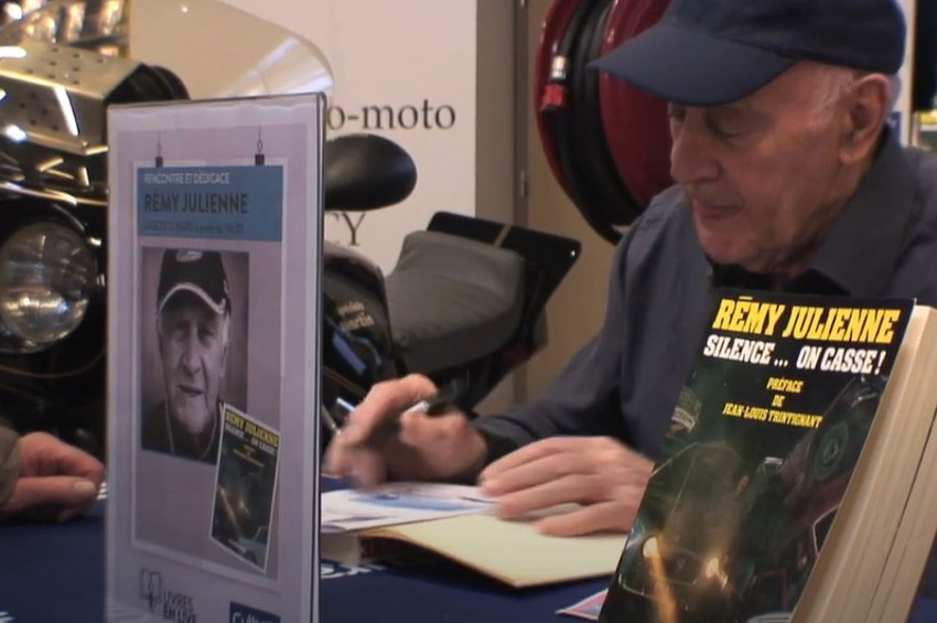 « Entouré de quatre James Bond Girl, signant les dédicaces de son ouvrage « Silence on casse » à Auxerre, préfacé par un autre fou furieux de l’automobile Jean-Louis TRINTIGNANT, le chevronné cascadeur Rémy JULIENNE avait noué des liens d’amitié très forts dans l’Yonne notamment avec Cyril PARMENTIER, à l’époque gérant du web tv, « TELE DIFFUSION »… ». « Entouré de quatre James Bond Girl, signant les dédicaces de son ouvrage « Silence on casse » à Auxerre, préfacé par un autre fou furieux de l’automobile Jean-Louis TRINTIGNANT, le chevronné cascadeur Rémy JULIENNE avait noué des liens d’amitié très forts dans l’Yonne notamment avec Cyril PARMENTIER, à l’époque gérant du web tv, « TELE DIFFUSION »… ». Crédit Photos : Collection Cyril PARMENTIER.