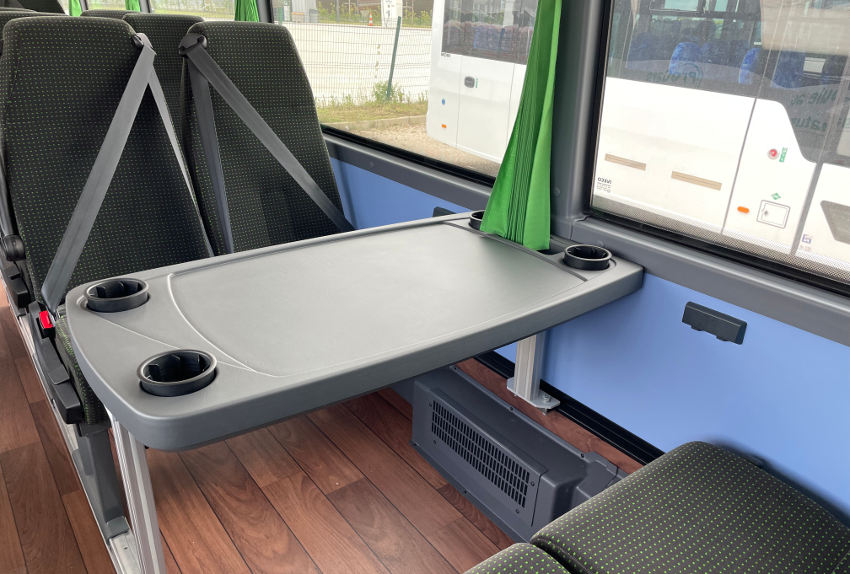 A l’intérieur, le bus, à l’assise confortable, est équipé des technologies numériques nécessaires pour faciliter les échanges et la réactivité informationnelle. Offrant l’opportunité de plusieurs places en face à face – l’idéal pour organiser un briefing entre quatre personnes – et d’optimiser ainsi le temps du trajet. Cela n’empêchera pas de jeter un petit coup d’œil sur les paysages défilant derrière les vitres, pour les plus rêveurs !
