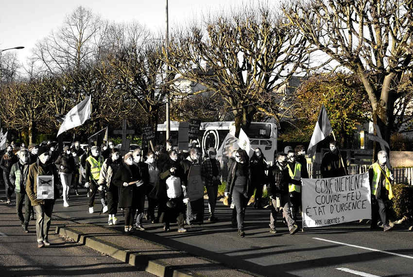 Les banderoles se déroulèrent bon train durant la déambulation. On pouvait y lire les slogans suivants : « Etat d’urgence = libertés en danger » ou encore « Confinement, couvre-feu, état d’urgence : et nos libertés ? ».