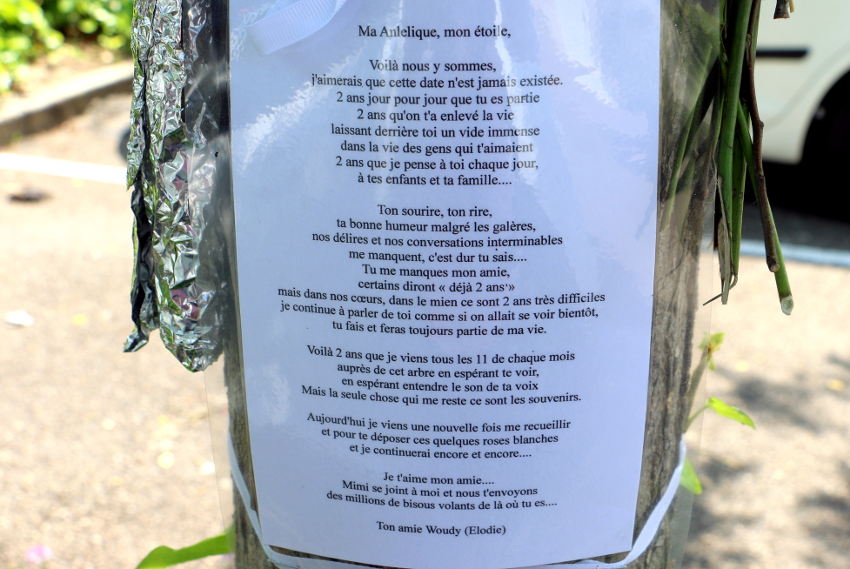 « C’est la société qui est malade, il nous faut la remettre d’aplomb et d’équerre par l’amour et la persuasion… ». Comment ne pas se remémorer ces vers du grand Julos BEAUCARNE, à la lecture de la lettre d’une amie d’Angélique CLERE, accrochée avec quelques fleurs, à l’arbre même devant lequel elle perdit la vie ? Quelques mots signés Elodie, évoquant le drame et sa présence tous les onze de chaque mois, pour se recueillir et parler à l’amie disparue… Quelques mots pour se souvenir… Quelques mots pour rappeler qu’envers et contre tout, l’amour sera toujours plus fort que la mort.