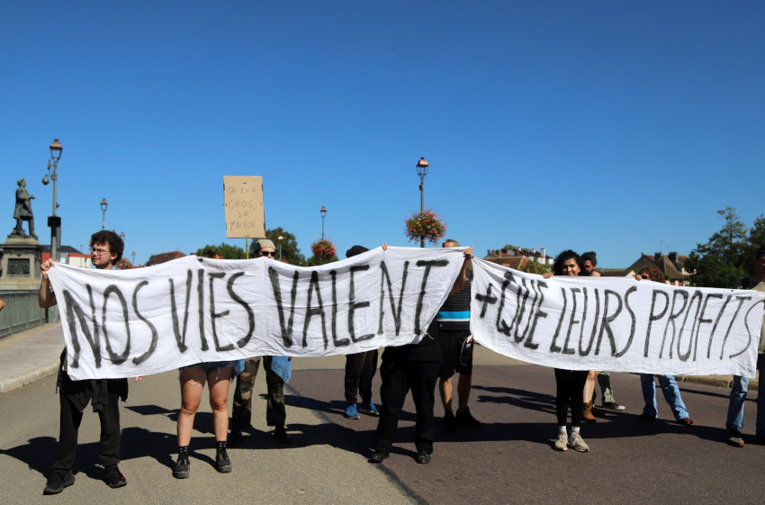 Tout au long du cortège, l’ambiance oscille entre détermination, ferveur et tension sourde. La sono fait le reste, pour un accompagnement musical des plus variés, mais aux couplets souvent « retravaillés », allant du classique « Bella Ciao » à Renaud et sa « Société qui ne l’aura pas », en passant par les chiliens de Quilapayun, Edith Piaf, Alain Souchon, ou plus surprenant, les Poppys et leur rengaine des années 70 aux accents d’actualité : « Non, non, rien n’a changé… » ! Quoi de plus banal qu’un accrochage sur un rond-point ? Si ce n’est qu’il résulte d’un face-à-face tendu après la collision évitée de peu à l’entrée de la rue de Paris, entre les drapeaux de la CGT et la banderole des « indignés 89 » « Nos vies valent plus que leurs profits », bloquant brièvement le cortège. Si l’échange reste verbal, quelques instants de flottement et ces mots lourds de reproches à l’attention des forces syndicales : « On vous attendait pour bloquer la nationale, où étiez-vous ? Vous n’êtes pas venus ! ».