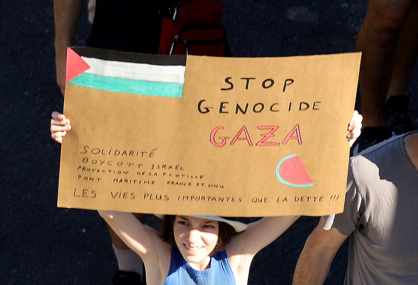 Le retour des syndicats et des colères enfouies. Aujourd’hui retraitée, Colette fait partie de ces « nantis » baby-boomers vilipendés par François BAYROU, venue sur la manifestation par engagement citoyen, à l’écart de toute organisation syndicale et très sceptique quant à l’avenir de la France : « nommer LECORNU à Matignon, c’est un peu déshabiller Pierre pour habiller Paul ! Cela ne changera rien à l’état dans lequel ils ont mis le pays. Qui va payer notre dette abyssale ? Une dette que l’on va laisser à nos petits-enfants en héritage… ». Fière pour autant du petit drapeau tricolore qu’elle tient bien en mains : « je me refuse à voir certains partis s’approprier nos couleurs nationales, il appartient à tous ! ». Un temps annoncé, les « casseurs » ne sont pas au rendez-vous, au grand soulagement des organisateurs qui savent bien que le moindre débordement aurait jeté le discrédit sur la journée d’action. Pour autant, la crise internationale et l’actualité se sont invitées dans la rue, comme en témoigne ce panneau de fortune avec le dessin d’un drapeau palestinien et ce message « stop génocide Gaza, les vies plus importantes que la dette ». Quelques badauds regardent passer le cortège dans une rue du Temple déserte comme à son habitude et petit moment de répit pour ce conducteur de bus électrique bloqué par les manifestants : « je ne suis pas en grève mais comprends tout à fait la colère qui monte. Je suis ce que l’on appelle un retraité actif, obligé de travailler encore de longues années faute d’une retraite suffisante pour vivre. S’ils me donnent 300 ou 400 balles de plus par mois, j’arrête, ce n’est pas plus compliqué… ».