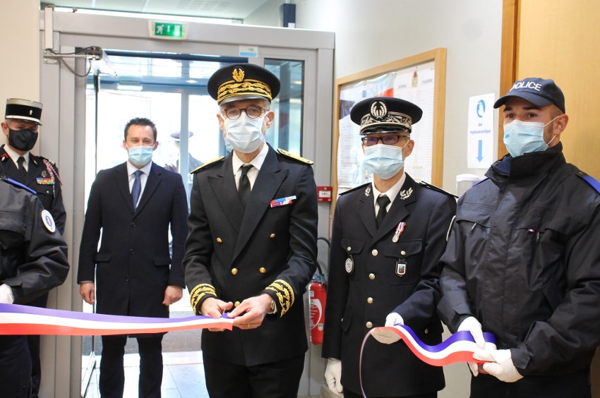 Aux côtés du directeur départemental de la sécurité publique et commissaire divisionnaire Raphaël JUGE, le représentant de l’Etat s’est attelé à couper minutieusement avec une paire de ciseaux le tissu tricolore dont il remit de petits morceaux à l’ensemble des personnalités présentes.