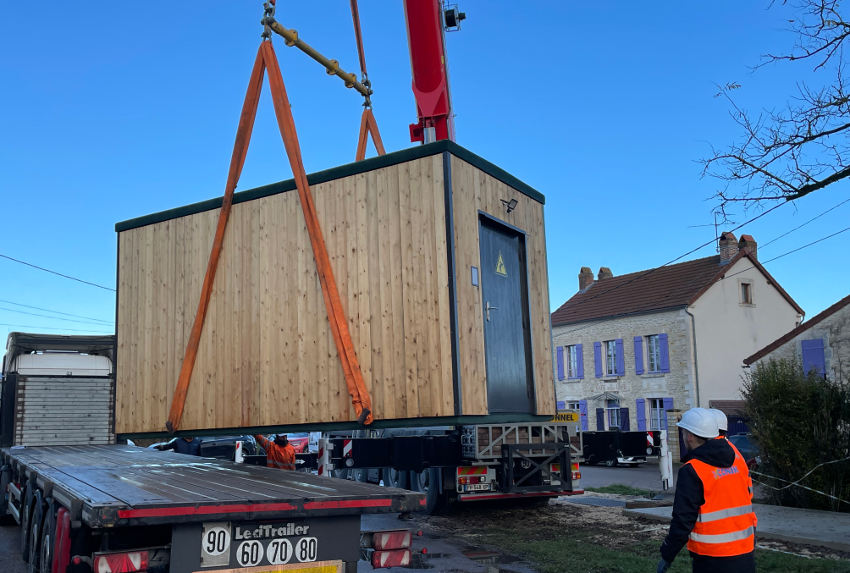 Dans les airs, un énorme bloc, la fameuse structure accueillant le dispositif de raccordement à la fibre optique, se meut très lentement et avec infime précaution tenu par de solides sangles depuis une remorque jusqu’à sa base où il sera déposé tout en délicatesse sur un socle de béton. Les attaches sont plutôt rassurantes vu le poids de cet ouvrage, qui présente une esthétique évoquant un revêtement fait de bois. Agréable à l’œil, selon les premiers commentaires du voisinage, et qui tranche avec la rudesse du bloc de béton façonné à l’état brut posé d’ordinaire. Un plus qui ne dépareille pas trop avec l’environnement.