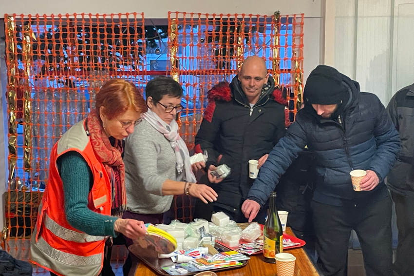On se régale copieusement autour de la grande table, garnie de confiseries, pâtisseries et autres boissons chaudes encore fumantes. La détente est de rigueur parmi l’assemblée : ça fait du bien quand on sait que dehors les morsures du froid abiment les mains et les visages. Sans oublier les cœurs pour celles et ceux qui ne connaissent que la rue pour s’y réfugier. La remise de sacs, bien remplis de kits de survie alimentaire et sanitaire, représente la cerise sur le gâteau de ces premières retrouvailles de janvier : on l’a doit au groupe scolaire Saint-Joseph, la JCE Auxerre et la Croix-Rouge. Nom de baptême de l’opération : SAKADO !