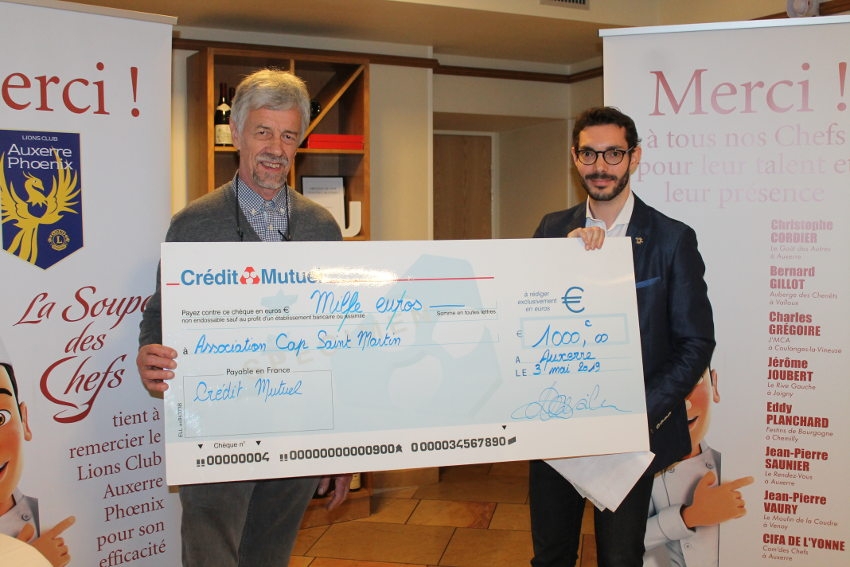 Le club service Auxerrois a pleinement réussi l’une des manifestations caritatives de la saison, « La Soupe des Chefs », organisée lors de la Foire de la Saint-Martin. Mobilisant la fine fleur de toques du territoire, le Lions Phoenix a pu dégager une manne financière appréciable dont est devenue bénéficiaire l’association Cap Saint-Martin. Elle vient en aide aux personnes atteintes de cancer et à leurs proches. La remise d’un chèque d’une valeur de mille euros ponctue cette action. Mais, celle-ci est d’ores et déjà reconduite dès novembre prochain…