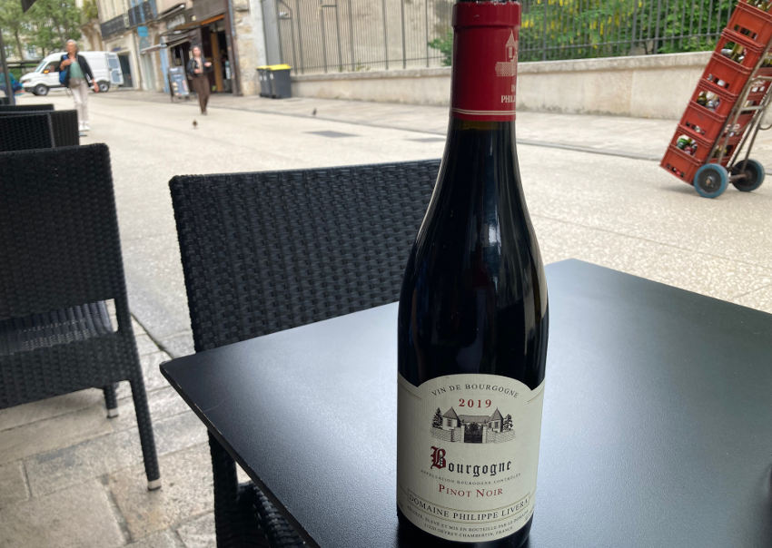 Pour se rafraîchir -  diantre, nous sommes en Bourgogne ! - la terrasse de la cave est plutôt accueillante : le Haute Côtes de Nuits d'un vigneron est à prix raisonnable (22 euros), contrairement à la tranche de pâté en croûte commandée en accompagnement qui facturée à 9 euros correspond à un tarif de 70 €/kg, soit le double d'un véritable artisan-charcutier (30 euros étant le tarif chez les artisans des « Petits cochons », sis à Saint-Clément). A ce tarif, on eut aimé une petite serviette en papier, histoire de s'essuyer ! Sauf que d'essuie-mains, il n'y eut point.